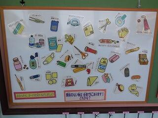 (下、保健室前にある防災グッズ、救急箱に必要なリストです)