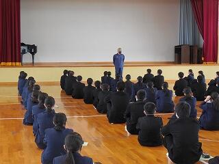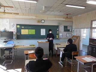(下、6時間目は3年生の私立入試事前指導が行われました。明日から様々な学校の入試が始まります。先生方から諸注意が行われました、下は宮脇学年主任の話です)