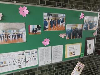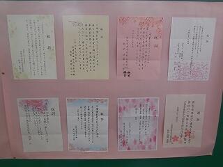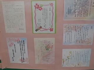 (下、1棟2階音楽室の掲示、2棟2回の掲示物、卒業式の祝詞を掲示しています、在校生も読んでいます)