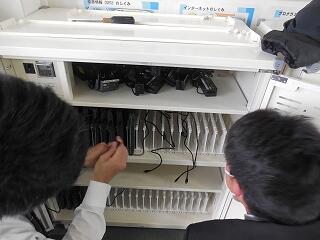(下、午後の職員作業で、次年度から活用するタブレットの整備(充電と設置)を行いました。)