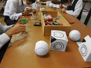 (下、3年3組技術の授業の様子です、プログラムの授業で使用するコロックルを製作しています)