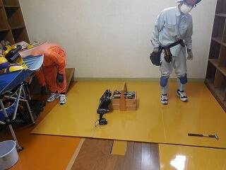 (下、市教委総務課の皆様と本校技術員さんが、体育館更衣室床の補強を行っていただいています)