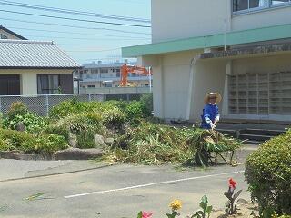 (下、本校技術員による正面の池掃除の様子です。)