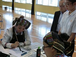 ④交流会(3年生が体育館で、延岡市について英語で紹介・習字体験・合唱披露「ふるさと」・ミャンマーの方々による踊り披露)