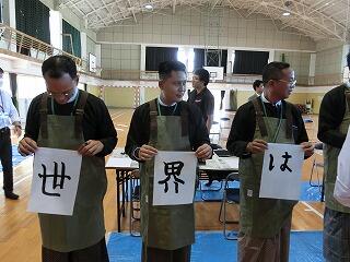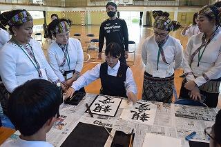 ④交流会(3年生が体育館で、延岡市について英語で紹介・習字体験・合唱披露「ふるさと」・ミャンマーの方々による踊り披露)