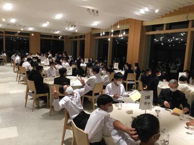 感染対策をしながら夕食を楽しみます。みんなすごい勢いで食べてます。