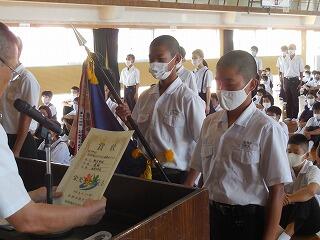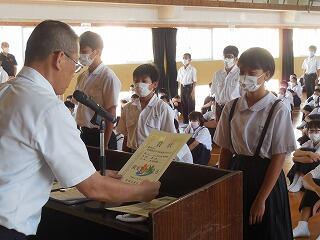 (下、全校集会での表彰、軟式野球、ハンドボール男女、陸上、水泳の表彰です)