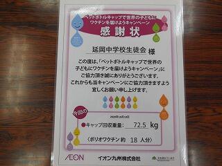 先日、本校の生徒会活動として集めたペットボトルキャップを生徒会役員の皆さんがイオン九州株式会社に届けました。キャップの回収重量は72.5キロで、ポリオワクチンの18人分に相当する量を届けることができました。回収に協力してくれた全校生徒の皆さん、キャップを集め、届けてくれた生徒会の皆さん、ありがとうございました。