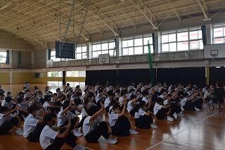 本日は水曜校時の5時間授業です。2年生は今日と明日職場体験学習で市内40の事業所で職場体験学習に参加します。3年生は実力テストの2日目で、5時間目には薬物乱用防止教室に参加します。