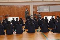 10月18日(金)の避難訓練(不審者対応)に向けて、事前指導を行いました。延岡警察署の方とPTA副会長の富井さんに不審者役をしてもらい、実際に不審者が来たときの対応やバリケードの作り方を確認し、練習しました。