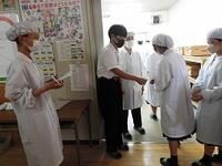 本日は給食室の様子をお届けします。全校給食委員長と副委員長を中心に、各学級の給食委員長で給食センターから届けられた美味しい給食を当番に渡しています。
