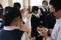 授業参観の後は、PTAのおやじ会によるふるまいが行われました。「天ぷらうどん」、「カレーライス」、「ミートソースペンネ」の3品から生徒は1つ選び食べました。