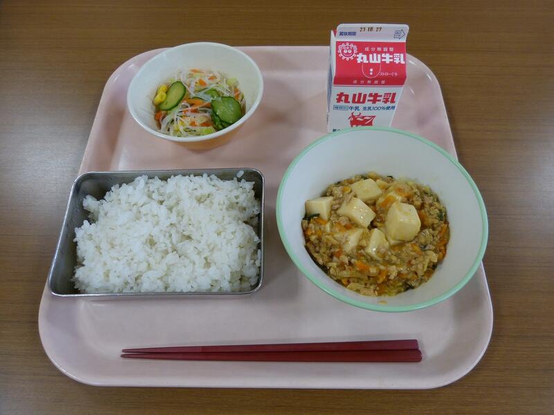 今日は、「代替肉」についてのお話です。代替肉とは、動物の肉の代わりに大豆などの食物原料を使い、本来の肉の味わいに似せた食品のことです。お腹の調子を整える健康機能などから体に良いと考え、代替肉に関心を持つ人も増えています。学校給食では、主に大豆ミートをよく使っています。今日の給食マーボー豆腐にも使っているので、どれが大豆ミートか探してみてくださいね。