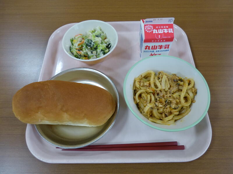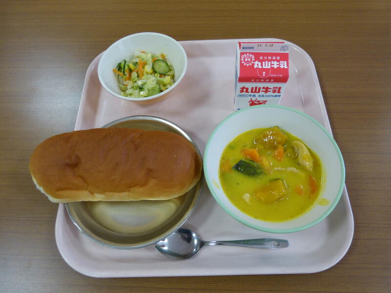 今日のカレーには、野菜がたくさん入っています。かぼちゃやなすも加えて夏野菜のカレーにしました。夏の暑い時期に旬を迎える夏野菜は、体の余分な熱をとるものが多くあります。野菜をしっかり食べることで、体の熱を冷まし、健康に過ごすことが出来ます。カレーだけでなく、サラダもおいしく食べてくださいね。