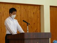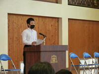 その後、生徒会の退任式が行われ、旧生徒会役員と専門委員長へ感謝の気持ちを込めた大きな拍手が全校生徒から届けられました。旧生徒会役員を代表して山﨑歩夢さんが今まで関わった方全員への感謝の気持ちや今までの生徒会役員としての任期を振り返っていました。