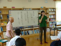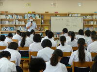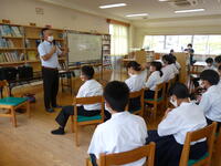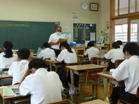 本校には毎月、ALTのアイコ・クマノ先生が来校し、それぞれの学年で勉強している文法を使って活動などをしていただいています。3年生では人やものを詳しく説明する言い方を勉強しています。イラストの人物を説明したり、文を正しく並べかえたりする活動をアイコ先生と一緒に活発に行っていました。