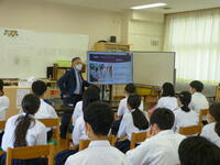 2年生の総合的な学習の時間に、県国際交流員のマーシュ・グレアムさんをお招きして、イギリスについての国際理解講座がありました。言語にも文化や歴史が関わっていること、いろんな国の言語が含まれていること、今まで考えることがなかった部分についても知ることができました。2年生の生徒たちにとって探求的な学びをすることができ、充実した時間となりました。