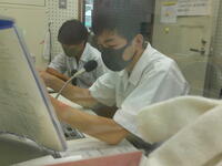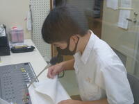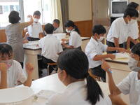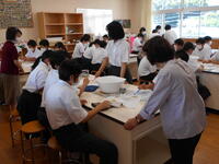 1年生の家庭科に、はげまし隊員の方々が支援に来られました。今回は、様々な「しみ抜き」の実習を行いました。隊員の皆様ありがとうございました。また、延岡市教委のご参観ありがとうございました。