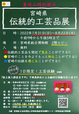 標記の件につきまして、県観光経済交流局オールみやざき営業課から周知依頼がありましたのでお知らせします。夏休み期間を利用して博物館において伝統的工芸品の展示を行い、伝統的工芸品に対する興味・関心を高めることを目的としているそうです。