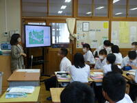 本校には毎月、ALTのアイコ・クマノ先生が来校し、それぞれの学年で勉強している文法を使って活動などをしていただいています。3年生では人やものを詳しく説明する言い方を勉強しています。イラストの人物を説明したり、文を正しく並べかえたりする活動をアイコ先生と一緒に活発に行っていました。