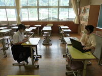 昭和20年(1945年)6月29日は延岡大空襲の日。戦争の悲惨さや平和の尊さを忘れないよう、図書室廊下にたくさんの資料が展示されています。資料によると、被害状況は、死亡(即死)130名(その後の調査で360余名と判明)、被災戸数3,765戸、被災人口15,232名。展示には、「兵士の体験記事」や「青空教室」「軍事訓練」「恒富小の校庭」「迷彩色の旭化成」などの写真もあります。
