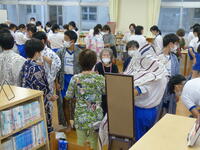 本日は、1の1着付け授業がありました。はげまし隊員6名の丁寧な説明のおかげで、不慣れだった生徒も上手に着こなすことができました。図書室が華やかなお祭り会場のようでした。ご指導ありがとうございました。13日(火)と16日(金)もよろしくお願いします。