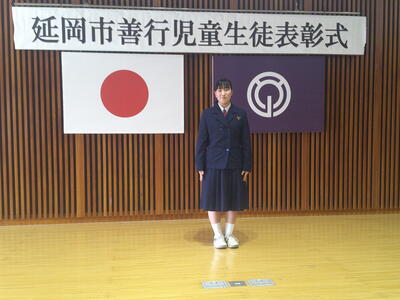 他者の模範となっている子どもたちをたたえる延岡市善行児童生徒表彰式が、延岡市役所講堂で行われました。本校からは3年生の嶽歩花さんが、地域での清掃活動に自主的に取り組む姿勢や、全校給食専門委員長でストロー削減の取組が評価され表彰されました。