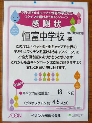 「ペットボトルキャップ回収 たくさん集まりました!」というタイトルで以前アップしました。イオングループからペットボトルキャップ回収についての感謝状が届きました。今回の回収重量は18kgでポリオワクチン4.5人分につながったようです。また、来年度も文化・整美委員会を中心にペットボトル回収を行う予定ですのでご協力をよろしくお願いします。
