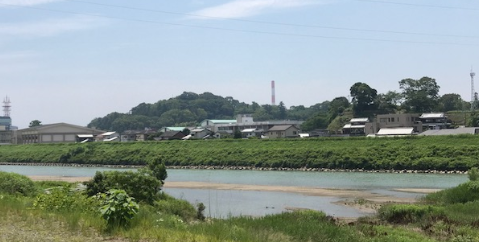 手前に五ヶ瀬川 右に内藤記念館、左に城山、奧に旭化成の煙突