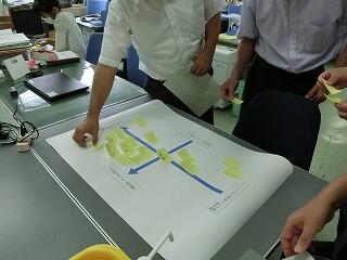 岡富中の生徒だったら、「こんな生徒であってほしい」というテーマで、職員研修を実施しました。学校の教育目標である「気力」「体力」「学力」「協力」を踏まえながら、先生方の想いを付箋紙に書き、学年毎に模造紙に貼っていきました。
