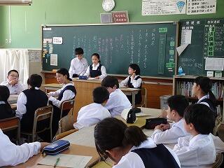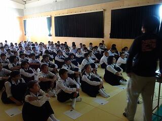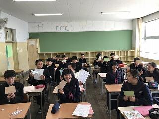 「岡富中学校のいいところを発表してください」「はい、笑顔がいいです!」