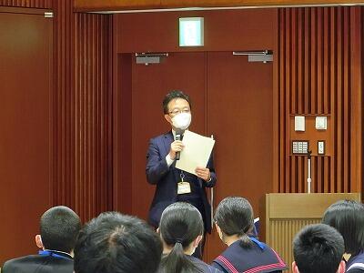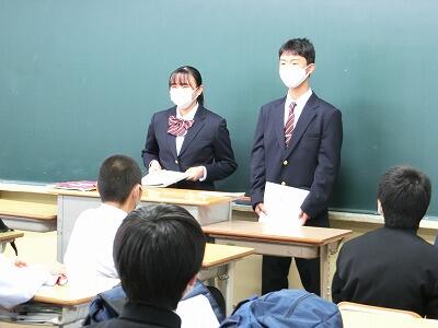 【 ↓ 生徒代表あいさつを後期美化委員長の山下颯太さんが述べました】