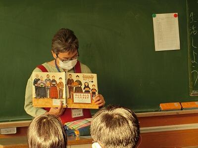 ボランティア「くす楠」の皆さん方から、朝の時間に読み語りをしていただきました。今日は、1年生の4クラスです。