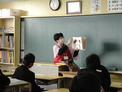 今朝も朝自習の時間は、読み語りボランティア「くす楠」による読み聞かせです。