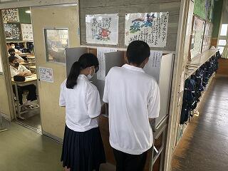 生徒会の本部から各教室をつなぎ、各教室間で意見交換する方法で実施し、各学級間では、活発な意見交換が行われました。