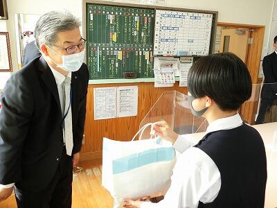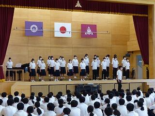旧生徒会のみなさんお疲れ様でした。市内の中学校に呼びかけて実施した風車プロジェクトを初め、全員で気持ちを一つにSDGsの視点も考えた全校生徒による手話での校歌表現もとてもよい企画でした。新たな取り組みで学校に活気を生み出しました。1年間お疲れ様でした。