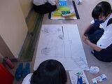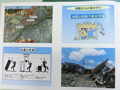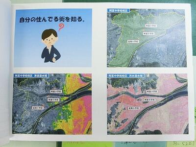 まずは自分の住んでいる街を知るということで、校区内の「津波浸水域」「洪水浸水域」「土砂災害警戒区域」ハザードマップを見ながら確認し、どう対応すればよいのかを考えました。
