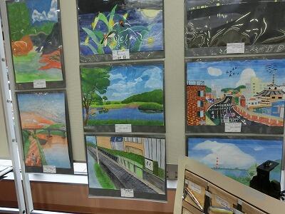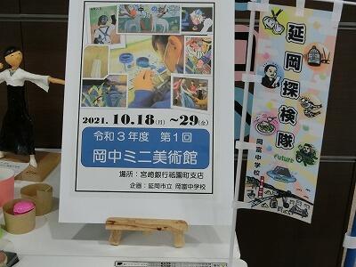 生徒たちの美術の作品を「延岡信用金庫本店」「宮崎銀行祇園町支店」に展示しています。この取組は、ふらっと訪れた施設で、岡富中の生徒の取組を地域の方々にも理解していただくことがねらいです。