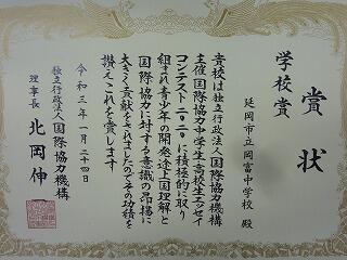 今回、第1学年で「JICA」の国際協力エッセイコンテストに応募しました。その結果、青少年の開発途上と国際協力に対する意識の昂揚に大きく貢献した学校に対する団体賞をいただきました。写真は、学校の方へ届いた「賞状」と「副賞(メダル)」です。