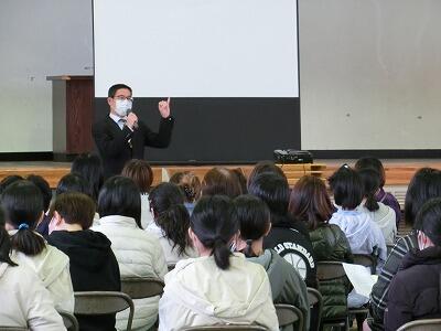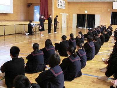 岡富中学校に新年度入学予定の新入生・保護者の説明会を本年度は、延岡小会場と岡富小会場に分けて実施しています。これまでは、岡富中学校体育館を会場に、まず授業参観をしながら学校の様子を感じてもらう…という流れでしたが、コロナ感染症対策の一つとして分散会場を考えました。会場の準備や駐車場の確保など、小学校の先生方の協力があってこその開催です。説明会では、学習面・生活面をそれぞれの担当から、学校生活や部活動については、生徒会役員がビデオで紹介しました。6年生の児童の皆さんの聞く態度が大変素晴らしかったです。真剣に話を聞いていました。皆さんが入学するのを楽しみに待っています。