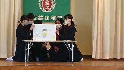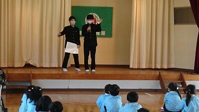 県の環境教育推進事業を受けて、中学校1年生が、わかば幼稚園や岡富小学校1年生を訪問しました。今回の学習は、これまで学んできた環境教育についての学びを分かりやすく、幼稚園生や小学校1年生に伝えることにあります。活動内容は4Rレンジャー、環境教育についての紙芝居、リサイクルおもちゃです。中学生の発表を幼稚園生も小学生もしっかり聞いてくれました。