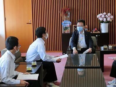 第3学年の総合的な学習の時間では、延岡で働く大人のPRポスターやPRビデオを制作しています。その中で、生徒の中からぜひ市長に聞いてみたいということで訪問することにしました。大変貴重な時間をさいてくださり、丁寧に回答していただきました。