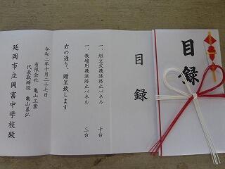 本日、昼休みに生徒会執行部4名が学校の代表として受け取らせていただきました。