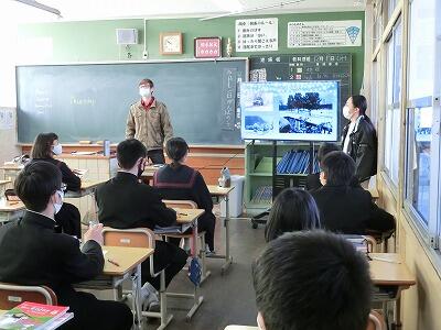 「安心・安全」「伝承・伝統」「技の広報活動」「働く喜び・誇り」という視点で撮った写真について、思いが伝わったかなどの観点で生徒全員で審査しました。発表会は、訪問した企業の方や市教委の方々にも見ていただきました。
