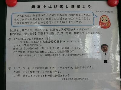 新型コロナウイルス感染症の影響で、本年度の学校支援はげまし隊の方々の活動も制限されています。学校に入って、直接生徒に接するのではなく、ZOOMを活用した面接練習を実施していただいています。今回は、はげまし隊の方から出題された問題をFAX等で回答するものです。各学級や学年の廊下にも掲示してあります。多くの生徒のみなさんチャレンジしてみてください。