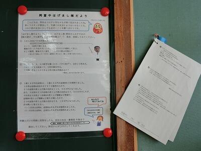 本日(1/8)、「遅刻・欠席連絡」掲示板についてのお知らせプリントを配付させていただきました。左上の緑の掲示板(一番下の枠)から、アンケートのページにお入りください。