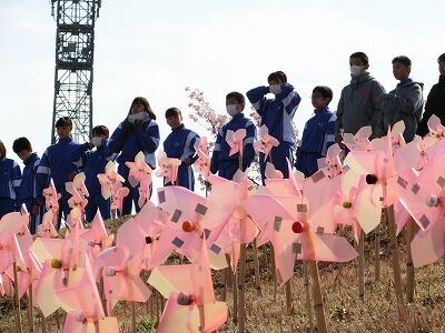 【 ↓ 昨年度の風車アート(今年は、間隔を開けて1列に設営)】