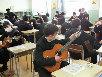 学校では、まず第一に「感染予防」、「学びの保証」、「新しい生活様式」などの対応を取っています。音楽の時間では、入室前の手指消毒を実施し、換気を充分にとりながらのギターの練習を実施しています。オンラインだけでは経験できない体験を実施していきます。もちろん感染予防第一で!!
