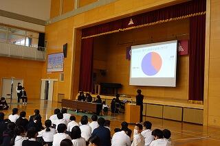 【 ↓ 3年生は、独自アンケートの結果など、根拠を明確にして発表していました。】