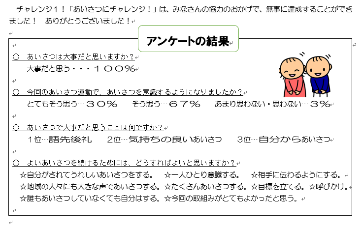 前回のチャレンジ1ではあいさつを頑張りました。プログラム委員会でアンケートを作成して、振り返りを行いました。その結果が下に載っています。